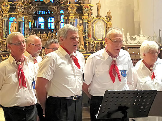 | Vor dem herrlichen Altar in der weihnachtlich geschmückten Kirche stellten wir uns auf. |