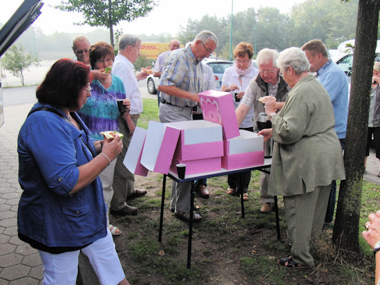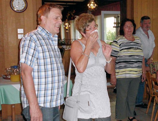 Bernd und Rudi (v. l.) eine kleine Überraschung: Die Beiden hatten diese erlebnisreiche Tour geplant - dafür gab es für beide ein kleines Präsent, das Hildegard in unser aller Namen überreichte. Wir alle sagen: "Danke!" für eine sehr, sehr schöne Tour. |