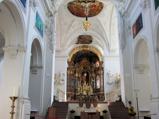 Stiftskirche "St. Petrus und Alexander". Zur 1000 Jahr-Feier 1958 wurde die Kirche von Papst Pius XII. zur "Basilika minor" erhoben. Sie ist die einzige päpstliche Basilika im Bistum Würzburg. |