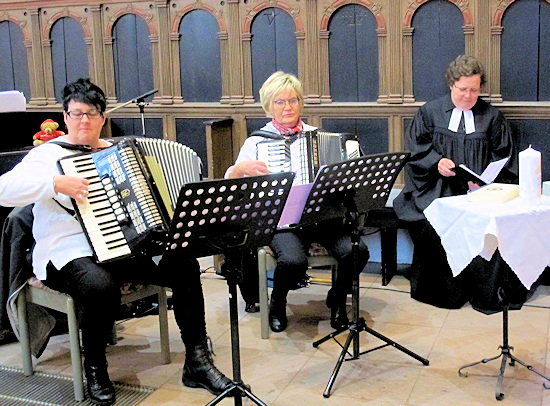 Katy und Edeltraut in die Tasten griffen, wartete Pastorin Birgit Faß auf "ihren Einsatz". |